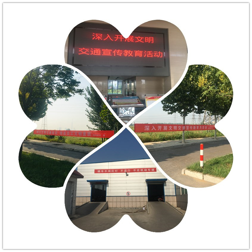 懸掛文明交通宣傳標(biāo)語(yǔ),營(yíng)造濃厚的宣傳氛圍。公司在廠(chǎng)區(qū)門(mén)口對(duì)面及存車(chē)棚外等懸掛文明交通宣傳教育標(biāo)語(yǔ),使員工在上下班路上抬頭就可以看到醒目的標(biāo)語(yǔ),特別是在存車(chē)棚處時(shí)刻提醒員工“騎車(chē)不闖紅燈、不逆行、不走機(jī)動(dòng)車(chē)道”。通過(guò)懸掛標(biāo)語(yǔ),營(yíng)造了濃厚的文明交通宣傳教育氛圍。