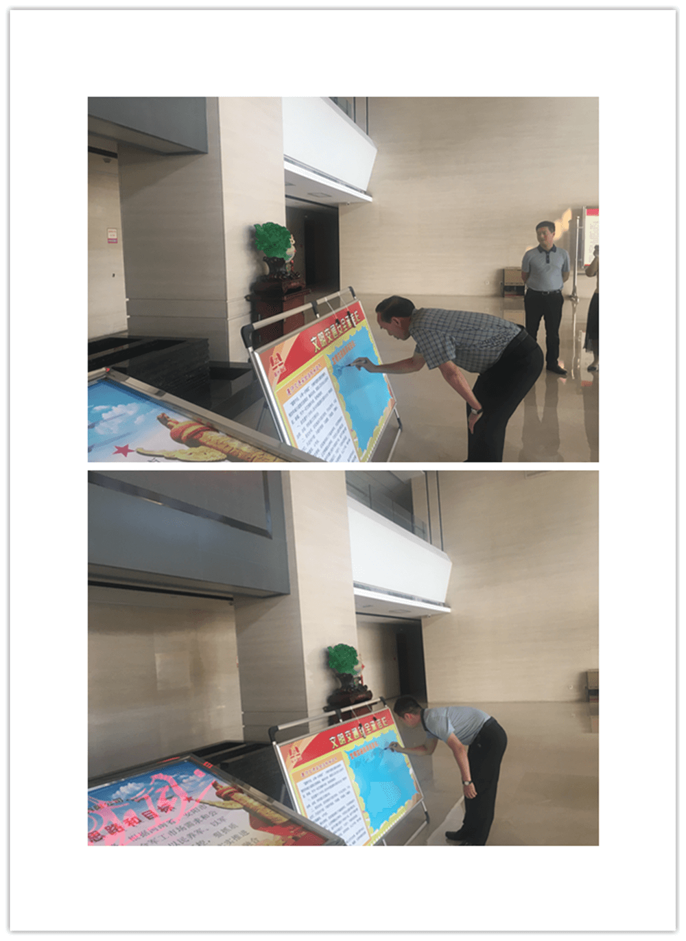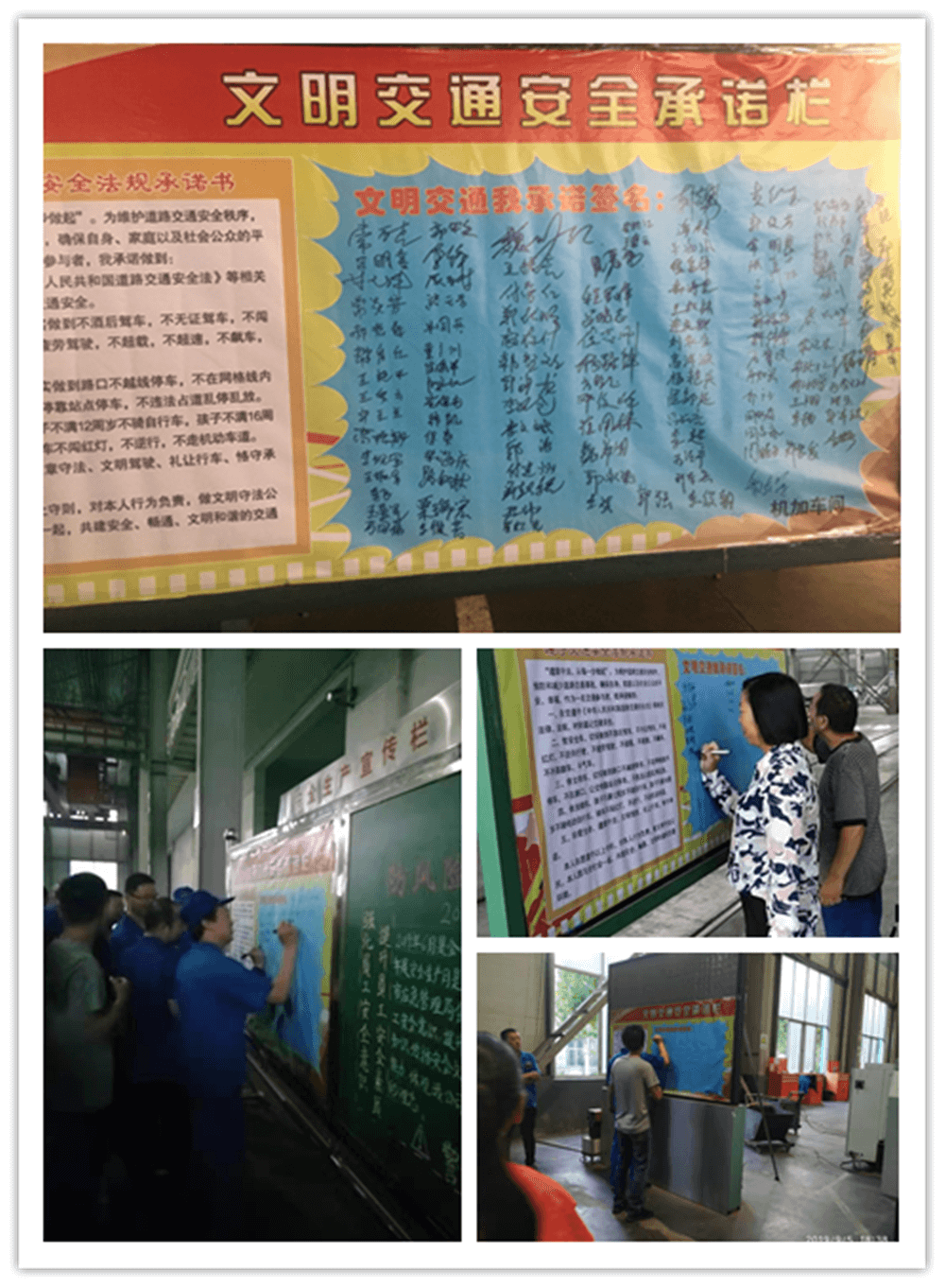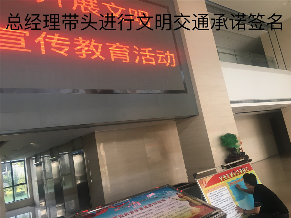 簽訂“遵守交通安全法規(guī)承諾書(shū)”。公司制作了“遵守交通安全法規(guī)承諾欄”版面十余塊,擺放在醒目位置,以部門(mén)為單位,每位員工在版面上進(jìn)行簽名承諾。公司總經(jīng)理郭釧帶頭在《文明交通承諾欄》上簽名,其他領(lǐng)導(dǎo)和部門(mén)員工也陸續(xù)進(jìn)行了簽名,通過(guò)交通安全承諾簽名,使每位員工時(shí)刻提醒自己,履行自己承諾。