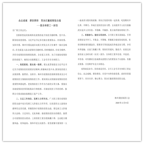 集團(tuán)黨委下發(fā)了《關(guān)于主動擔(dān)當(dāng),爭做表率,在新型肺炎疫情防控工作中充分發(fā)揮黨組織的戰(zhàn)斗堡壘作用和黨員先鋒模范作用的通知》,動員公司黨員在防疫工作中主動作為,勇于擔(dān)當(dāng),打贏防疫戰(zhàn)爭。公司工會向員工發(fā)出《眾志成城,群防群控,堅(jiān)決打贏疫情狙擊戰(zhàn)》的倡議信,動員全體員工立足崗位,服從指揮,做好疫情防控工作。